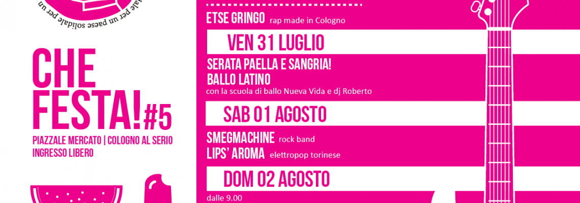 Da giovedì 30 luglio a domenica 2 agosto torna la quinta edizione di Che festa! #5, la festa del nostro gruppo civico. Qui sotto trovate il programma.