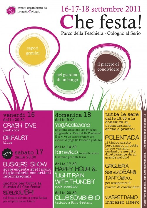 Dal 16 al 18 settembre 2011 ProgettoCologno ha organizzato la prima edizione di CheFesta! Il volantino riportato di seguito illustra ciò che abbiamo fatto.