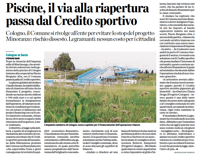 Rassegna Stampa Centro natatorio: la maggioranza pensa di poter scaricare il problema da lei creato sul Credito Sportivo! 29 Ottobre 2014 da progettocologno Da L’Eco di Bergamo di martedì 28 ottobre 2014