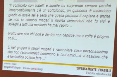 2015 | Azioni | Timeline Diversamente fratelli 28 Marzo 2015 da progettocologno Venerdì 27 marzo 2015 in una sala civica gremita di gente si è tenuto l’incontro dedicato al tema dei rapporti tra fratelli nella disabilità. Grazie a chi ha partecipato, alla giovane Elisabetta per la sua testimonianza e alle tre relatrici.