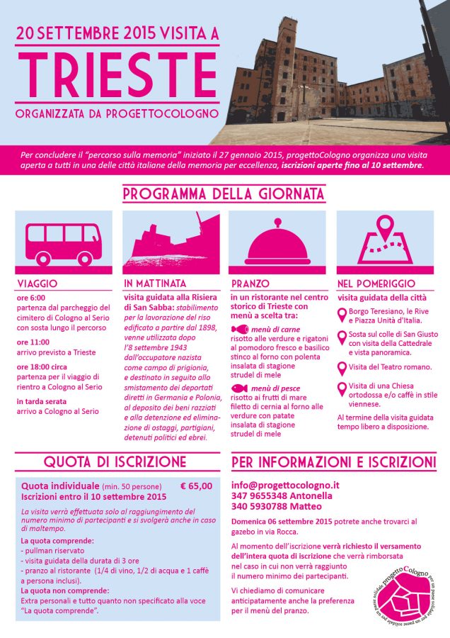 Per concludere il “percorso sulla memoria” iniziato il 27 gennaio 2015, progettoCologno organizza una visita (in giornata) in data 20 settembre 2015 a una delle città della memoria per eccellenza. Le iscrizioni si chiuderanno il 10 settembre 2015.