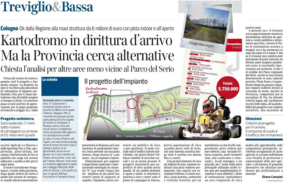 Prima del rombo di motori e gomme sarà il progetto a fare molto rumore. La Regione ha dato il via libera alla procedura di valutazione di impatto ambientale (Via) per il maxi kartodromo che dovrebbe sorgere a Cologno al Serio. Un ulteriore passo avanti nell’iter di approvazione per il piano proposto al Comune a maggio 2011 dalla società Agricola La Bizzera e dalla Sporting Tiro a Volo, proprietaria, quest’ultima, del campo internazionale di tiro al piattello che sorge nel terreno adiacente a quello scelto per la super pista. Il nuovo kartodromo bergamasco, il terzo della provincia, dopo quello storico di Curno e quello più recente di Antegnate, stando alla documentazione presentata in Regione,sarà una struttura di proporzioni enormi. Sono previste sia una pista esterna, lunga intorno ai 1.400 metri , sia un impianto indoor. Dimensionato per ospitare competizioni nazionali e internazionali omologate in categoria “A” (4/5 eventi l’anno) per un