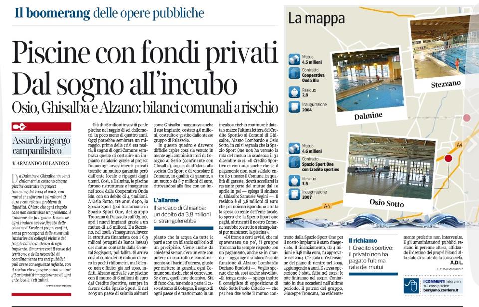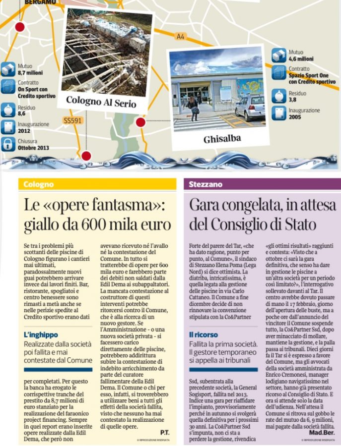 Se tra i problemi più scottanti delle piscine di Cologno figurano i cantieri mai ultimati, paradossalmente nuovi guai potrebbero arrivare invece dai lavori finiti. Bar, ristorante, spogliatoi e centro benessere sono rimasti a metà anche se nelle perizie spedite al Credito sportivo erano dati per completati. Per questo la banca ha erogato le corrispettive tranche del prestito da 8,7 milioni di euro stanziato per la realizzazione del faraonico project financing. Sempre in quei report erano inserite opere realizzate dalla Edil Dema, che però non avevano ricevuto né l’avallo né la contestazione del Comune. In tutto si tratterebbe di opere per 600 mila euro e farebbero parte dei debiti non saldati dalla Edil Dema ai subappaltatori.